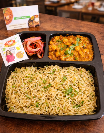 Flavorful chole cooked in a rich, spiced gravy served with steamed rice, creating a comforting and filling North Indian meal.