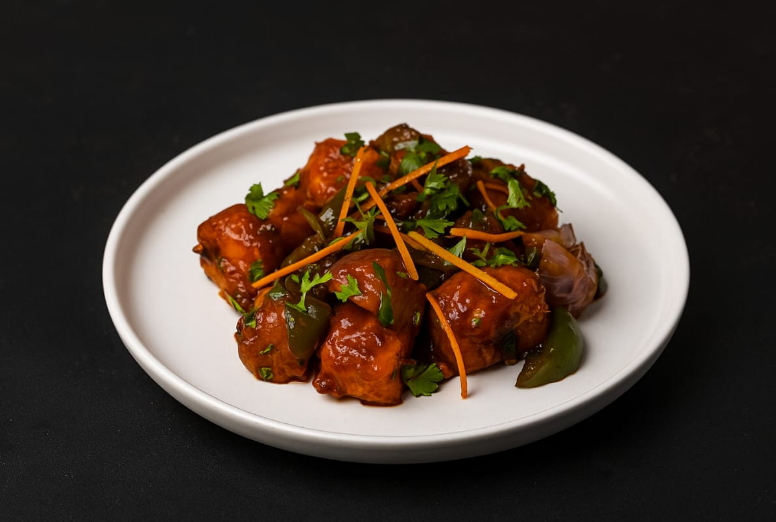 Crispy paneer cubes tossed in a spicy, tangy Indo-Chinese sauce with crunchy bell peppers and onions, delivering a bold and flavorful bite in every serving.